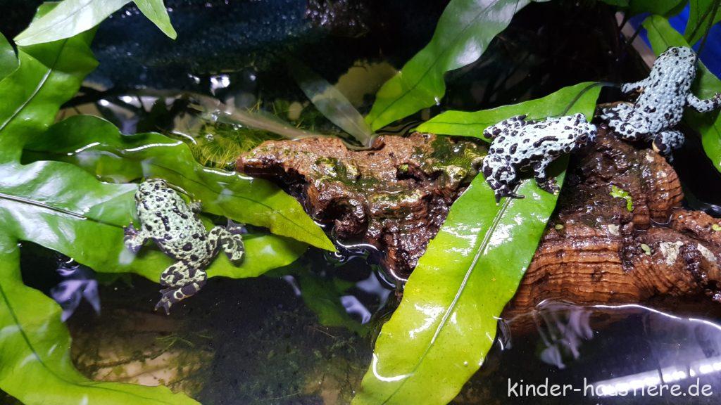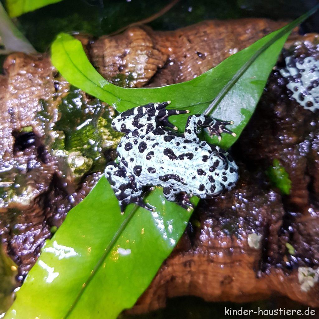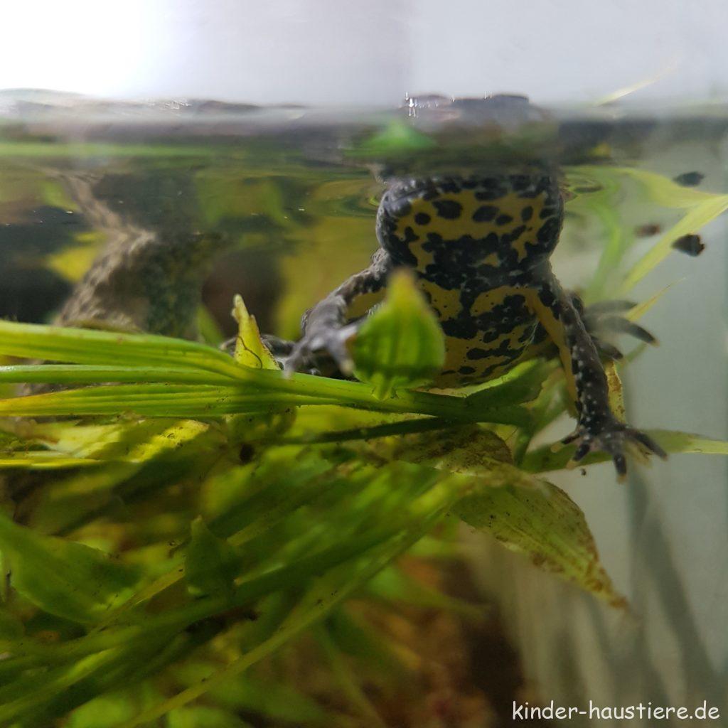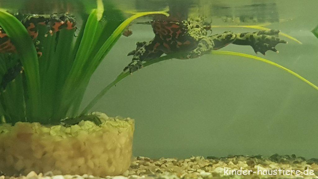 Unken sind neugierige Gesellen. Sie begreifen relativ schnell, dass der Mensch ihnen Futter reichen kann. So kann man die Fröschlein „pinzettenzahm“ bekommen, das bedeutet, dass sie Futter, das mit einer Pinzette hingehalten wird, gerne annehmen. Man kann die Futtertiere aber natürlich auch einfach ins Aquaterrarium geben und die Unken gehen selbst auf Jagd.