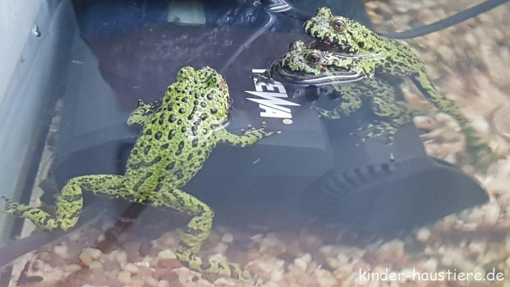 Unken koten recht viel ins Wasser, daher ist ein Filter nötig. Die Schwierigkeit besteht in dem flachen Wasser, da kommen nicht viele Filter in Frage. Gut geeignet ist der Eheim miniFlat. Sobald der Durchfluss merklich nachlässt, sollte man die Filterpatrone gründlich mit handwarmem Wasser ausspülen und kann sie dann weiter verwenden.