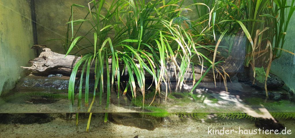 Auf den Boden des Wasserteils kann man eine flache Kies- oder Sandschicht einbringen. Der Wasserteil muss nicht unbedingt bepflanzt werden, es sieht mit etwas Wasserpest, Hornkraut, Wasserlinsen oder anderen Pflanzen schöner aus. Im Wasser müssen mit Moorkienholzwurzeln und Steinen Versteckmöglichkeiten geschaffen werden. Wenn diese bis kurz unter die Wasseroberfläche gehen, so nutzen die Tiere sie auch gerne zum ausruhen.