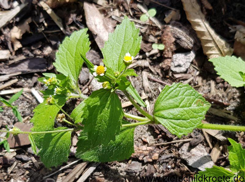 Das Franzosenkraut ist nicht gerade meine Lieblingspflanze, denn ich bekomme es im Garten nicht in den Griff. Es vermehrt sich an Stellen, wo es mich stört. Das positive: Bartagamen fressen es gerne. Das Franzosenkraut wird auch Behaartes Knopfkraut genannt. Es gibt auch Kleinblütiges Knopfkraut (Galinsoga parviflora), welches unbehaart ist. Beide kann man verfüttern.