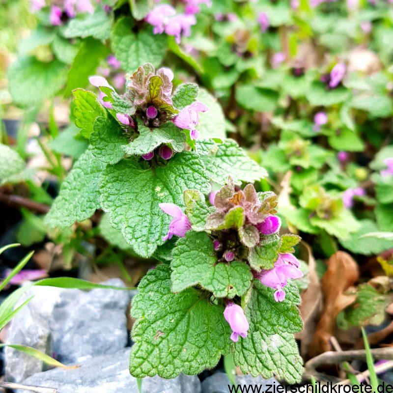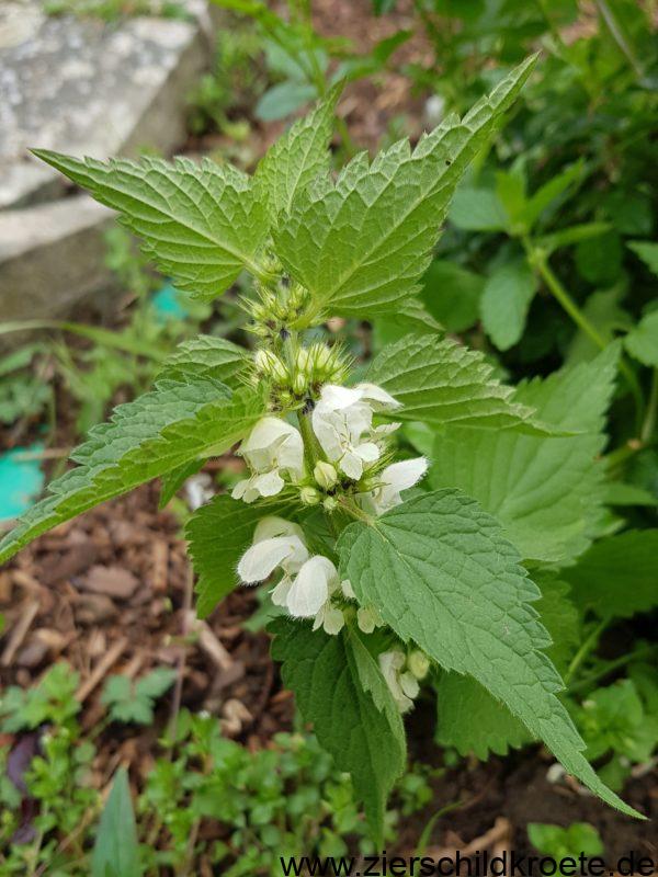Die Weiße Taubnessel blüht von April bis Oktober weiß. Andere Taubnesseln blühen gelb (Gold-Taubnessel, Lamium galeobdolon) oder rötlich (Rote Taubnessel, Lamium purpureum). Alle drei sind ein wunderbares Bartagamen-Futter und Handschuhe benötigt man beim Pflücken auch nicht.