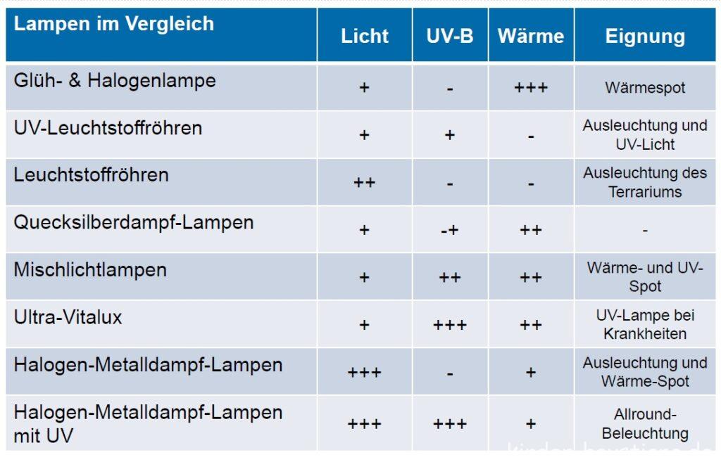 Bei Bartagamen ist aber immer eine Halogen-Metalldampf-Lampe mit UV-Anteil besser zur Erwärmung des Sonnenplatzes geeignet. Denn diese geben ähnlich viel Wärme wie Glühbirnen ab, aber auch ein sehr viel helleres Licht, zudem UV-A und UV-B.