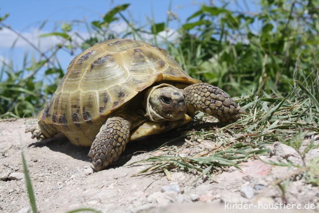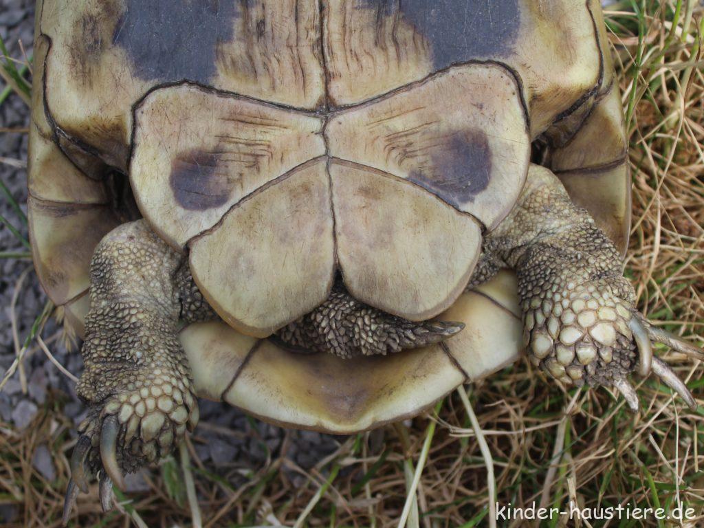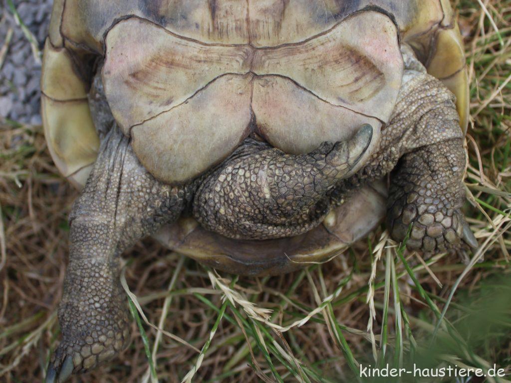 Das Hauptmerkmal zur Unterscheidung der Geschlechter ist ihr Schwanz. Bei Männchen ist es länger und am Schwanzansatz dicker. Der Schwanz ist also insgesamt größer, das liegt daran, dass der Penis dort hineinpassen muss. Außerdem ist die Kloake (das ist der gemeinsame Ausgang der Reptilien für Kot, Urin und Geschlechtsorgane) weiter vom Schwanzansatz entfernt. Männliche Landschildkröten tragen ihren Schwanz bei der Fortbewegung meistens an den Körper angelegt. Laufen Weibchen durch die Gegend, so tragen sie den Schwanz oft ausgestreckt. Weibliche Landschildkröten haben einen eher kurzen und dünneren Schwanz, die Kloake ist näher am Schwanzansatz.